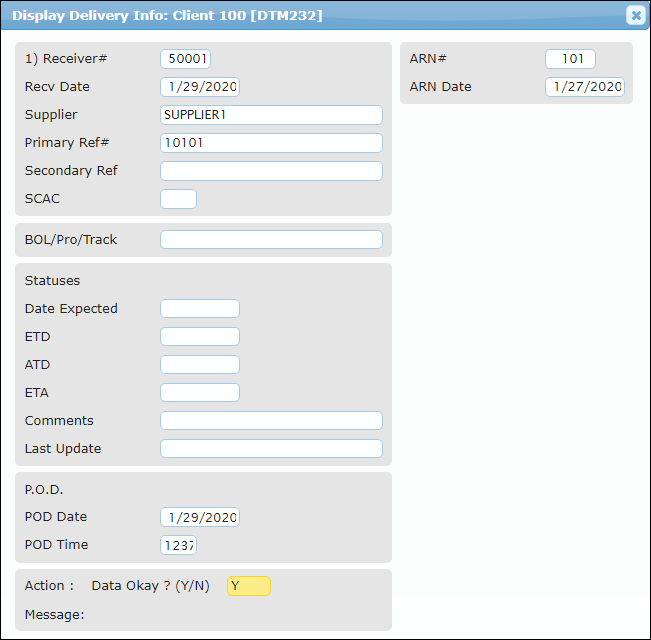 To view a Receiver's delivery information summary, access the "Delivery Info Display" option on the "ARN/Receipt Processing" menu. The screen displays the originating ARN's ETA/ETD/ATA dates, as well as the Receiver's Proof of Delivery (POD) date. This date is derived from the Receiver's Post Date.