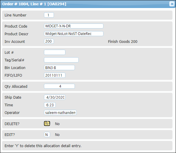 If the user needs to remove any of the Allocation entries, the delete functionality can be found in the F4 Inquiry. Double-click a record and a screen with the Order's Allocation information displays. To delete the entry, at "DELETE?" select ‘Y' (Yes) otherwise select ‘N' (No). If "Y" is selected, the user will be asked again, "Are you sure?" before conducting the deletion.