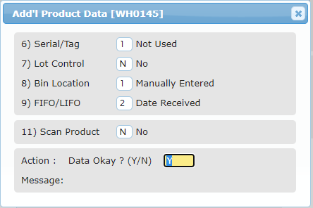 Based on the line's Product Master File settings, the Manual Allocation process prompts for any required information. As a result, the screen changes based on the Product Code being allocated. See Products for more information on product master inventory attributes.