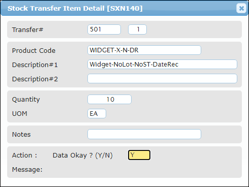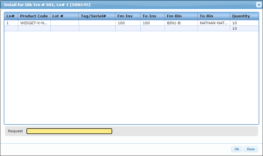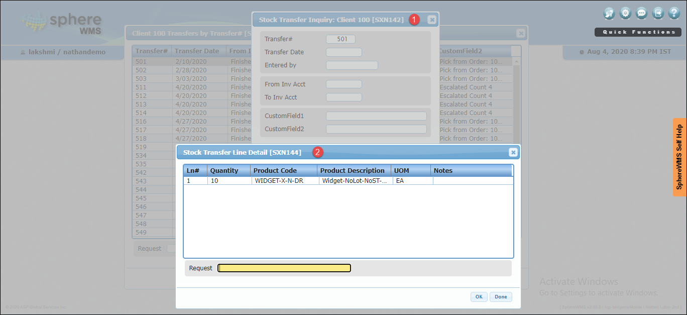 The stock transfer inquiry and line details of the selected transfer number will display. In the below screenshot 1 is the header for the selected transfer number and 2 is the lines for the selected transfer number. The Stock Transfer Line Detail dialog will display.